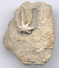 The close-up view of specimen #2 shows a faint round reddish circle in the middle of the star in place of a pit or depression. It appears that the colony covered over some reddish mud present in the area of an original depression by secreting added skeleton onto the base of the colony.