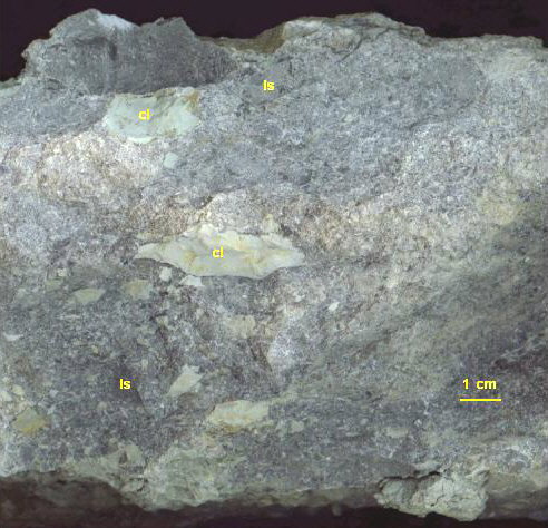 unit. Clasts, which include both claystone (labeled "cl") and limestone