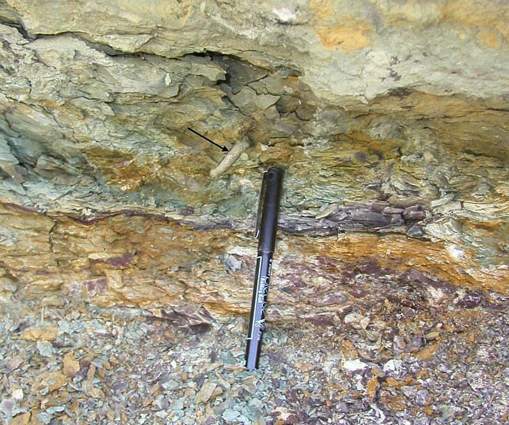 Oblique transported phosphate nodule in bioclastic shale subunit of Lake Neosho Shale
