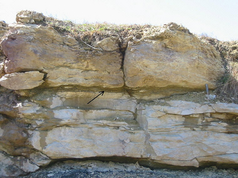 at bedding surfaces, forming very thin shale laminae. Note the hammer