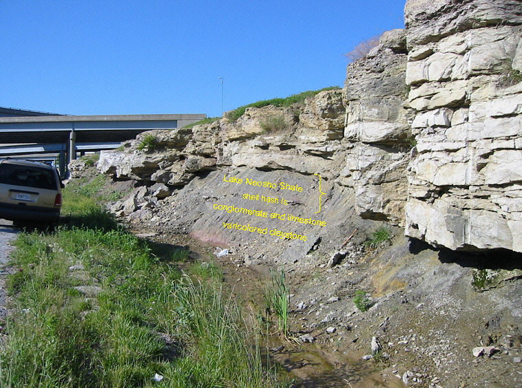 of the I-70 overpasses. Strata marked by the bracket are missing where