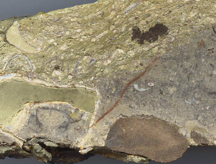 Close up of slab of transition zone from Lake Neosho Shale to Worland Limestone