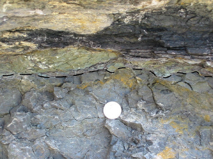 Limestone (base shows at upper left) rests directly on the coaly layer,