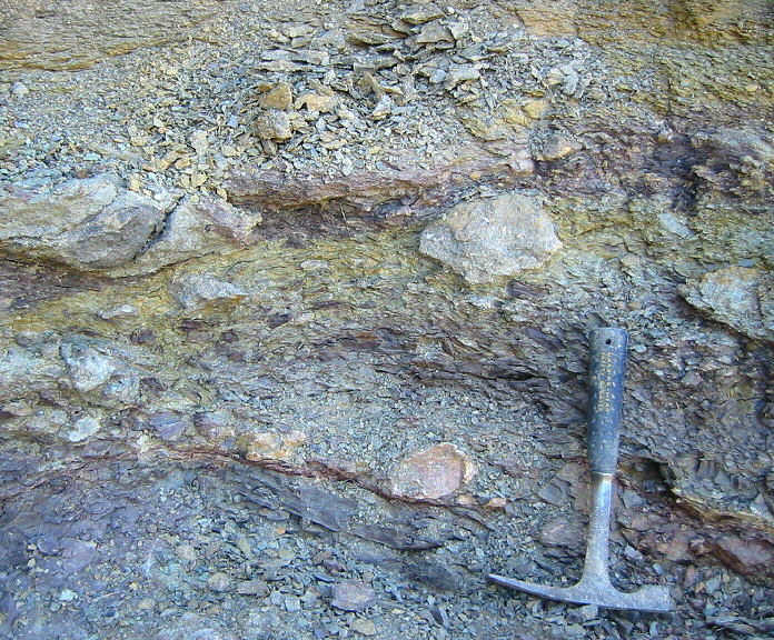 The most conspicuous clasts in this clayey matrix-supported