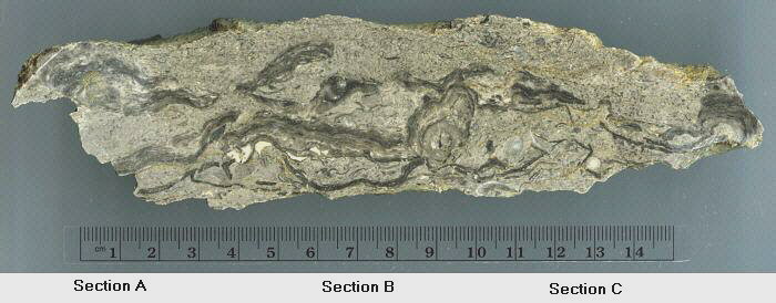 suggests deposition in well-lit, shallow water. Fragmentation of the algal