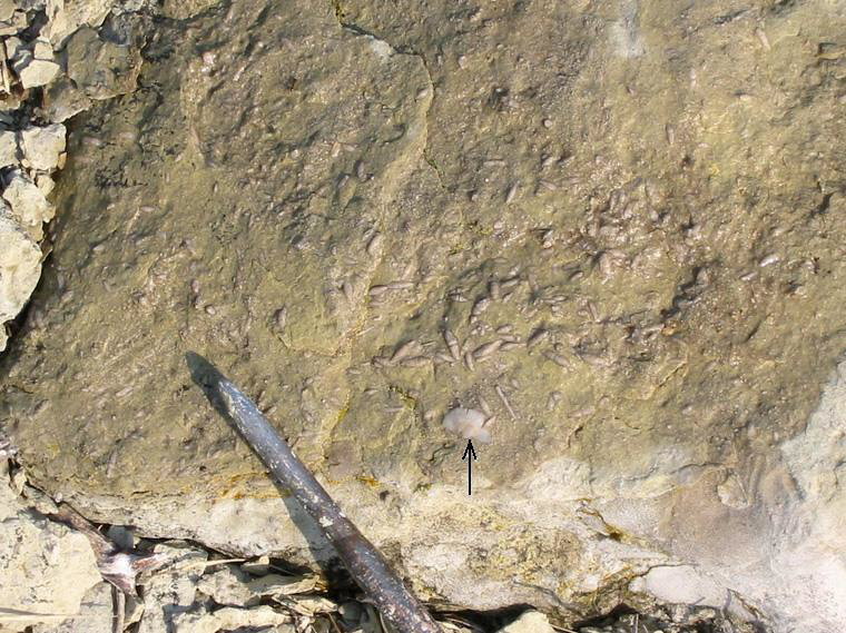 The arrow points to a chonetid brachiopod, and a single echinoid spine