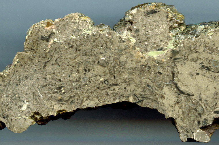 Close-up, undulatory algal fragment limestone slab from conglomerate and limestone unit