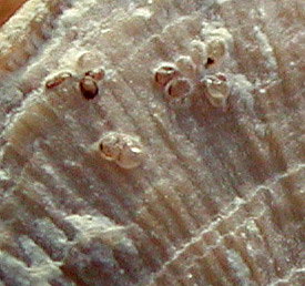 The larger clusters are about 1.5 mm in diameter. Individual "eggs" are about .5mm in length,