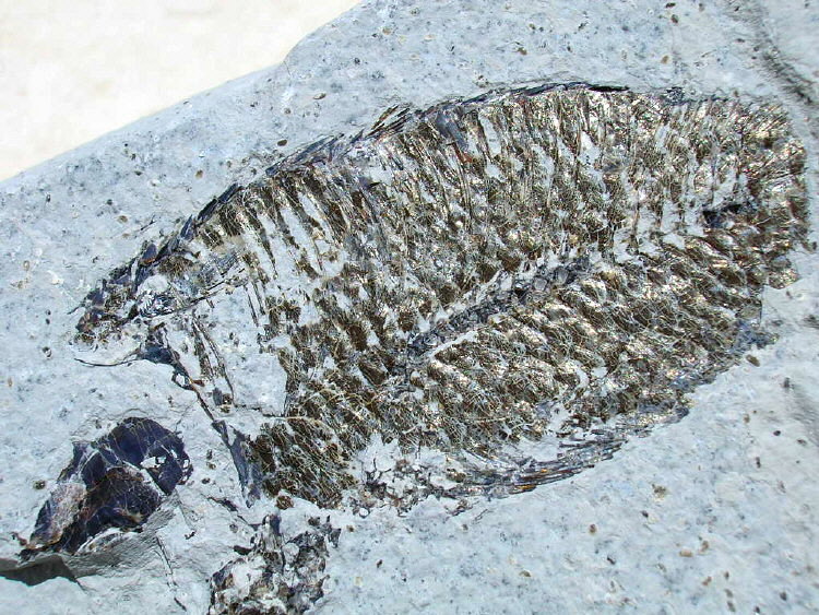 A close up of fossilized scales and fossilized skin.