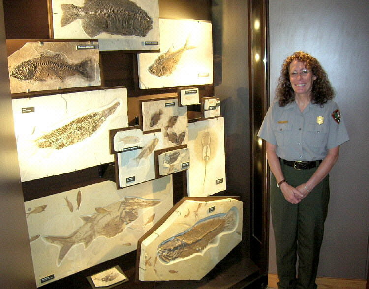 Park ranger standing next to one of the actual fossil