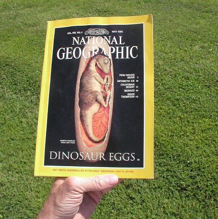 The stone eggs and the National Geographic magazine makes