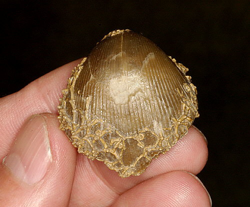 Theodossia hungerfordiAssociated fossils: Colony of an auloporid coral and Spirorbis sp. (worm tubes)