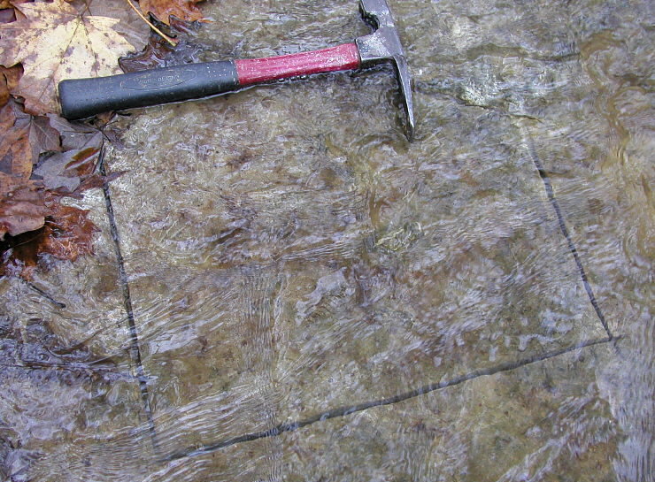 He is taking his time because there are several crinoids on this slab.