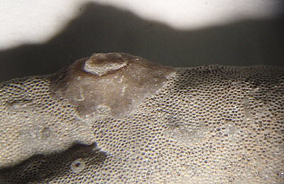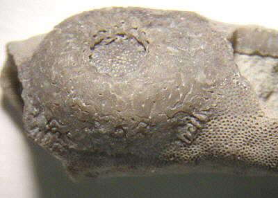 A flattened crinoid holdfast coating part of a bryozoan.