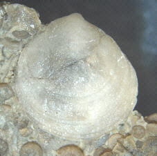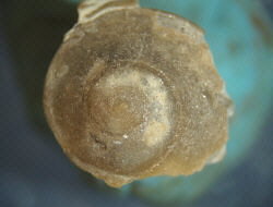 Liospira micula is a flatten snail typically under 1 cm wide. The steinkern is a Liospira,