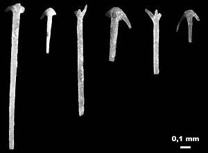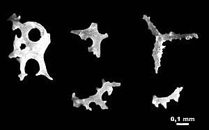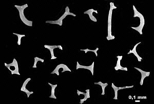 These photos show several types of siliceous sponge spicules that form